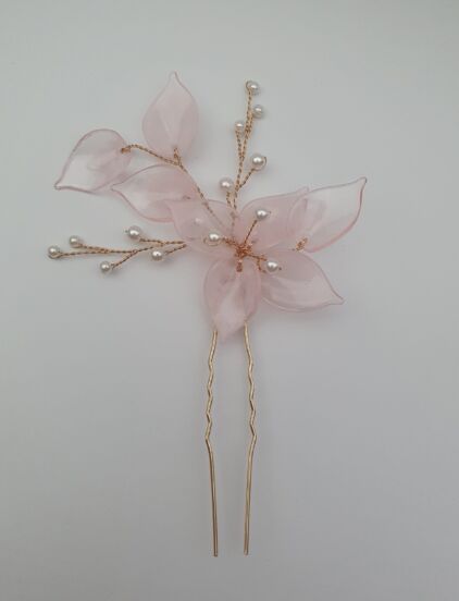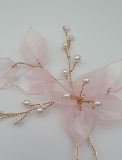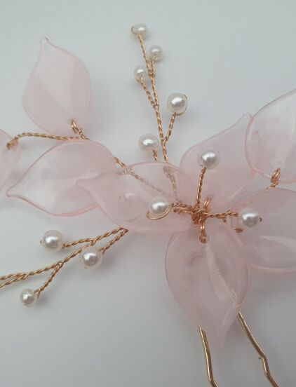 Beautiful rose quartz colour flower and leaves adjoining by pearls, attached to a hair pin. The daintly pliable, rosegold wires can be bend and shaped to your desire.