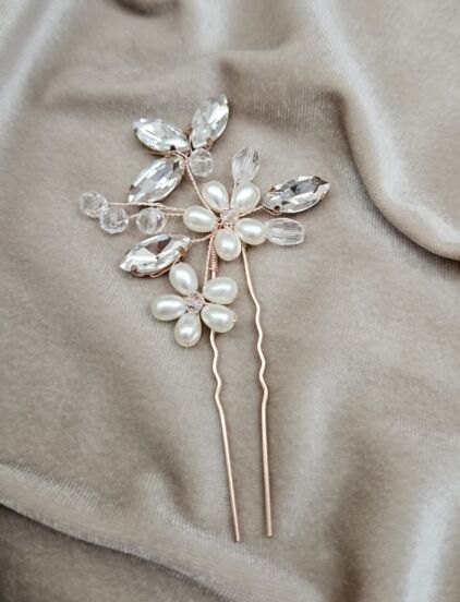 A beautiful rose gold, hair pin adorned with pearl flowers adjoining by clear crystals and diamantes. The daintily pliable, rose gold wires can be bend and shaped to your desire.